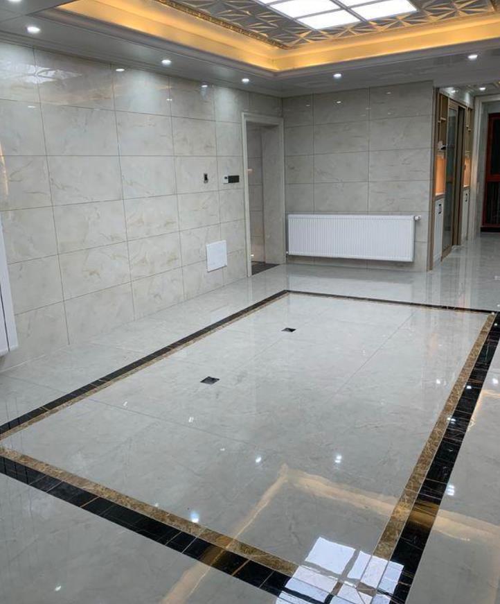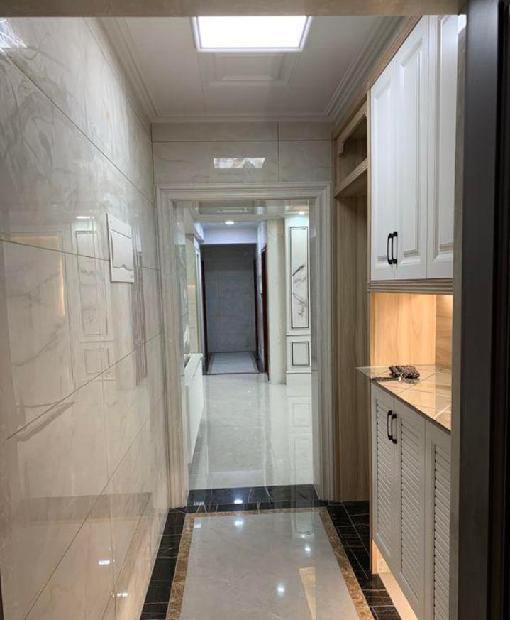 不得不承认,活还是干的挺好的,这个是进门的玄关,侧面墙上全部都是贴的瓷砖,另一侧打造的鞋柜也都是上下式的,中间和底下都留空了,台面置物,底下还能放家具拖鞋,地面还特意圈了两圈的波导线,很有档次。
