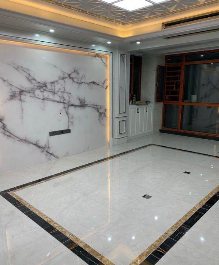 客厅的地面瓷砖也是用波导线装饰的,啡网和黑金花的大理石波导线很好看,搭配起来更大气,天花板还是觉得有些多余的,毕竟灯池吊顶就很好看,再装集成吊顶就浪费了,还不如装个漂亮的吊灯呢。