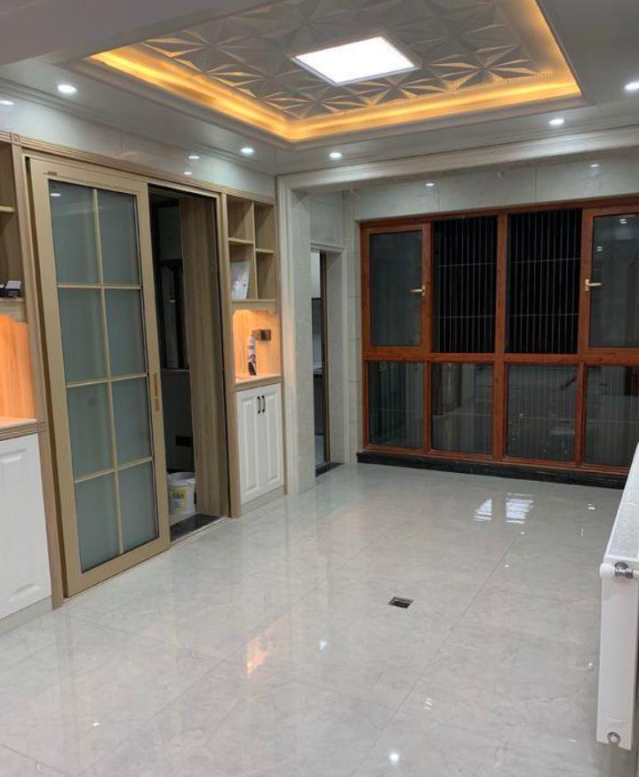 这边就是餐厨区了,没在地面下功夫,总觉得少了点什么,吊顶倒是也和客厅一样,装的是集成吊顶,侧面的厨房推拉门比较给力,两侧还装了嵌入式的柜子,当做餐边柜都没问题。