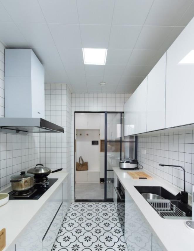 厨房采用两面橱柜操作空间广阔,左右转身就能操作全局。