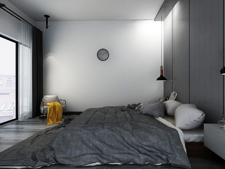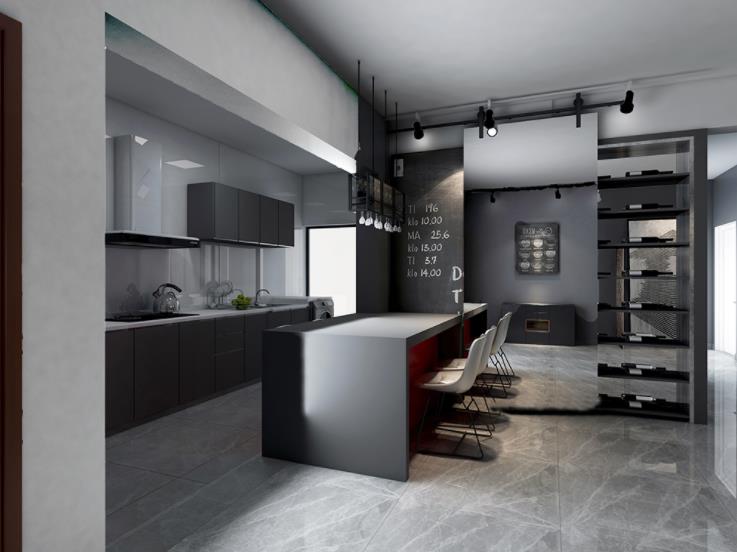 【设计说明】:本案定位是极简风格混搭工业风。业主个性而向往自由,在工作之外中找到自己的独立空间。设计上,在黑白灰的搭配中,软装和配饰上用一下饱和度高的颜色提亮空间。把收纳和实用运用在空间中,谷仓门推拉把酒柜做个收纳隐藏。在空间的流线和空气的流动性做了周全的设计。
