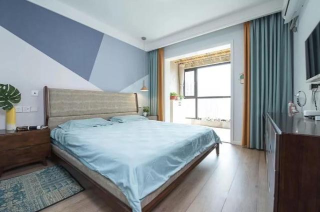 主卧与阳台,装修设计上是连在一起了,这样卧室更显大,走动更方便了。超喜欢背景墙上,这不同颜色的拼接,时尚、个性又漂亮。