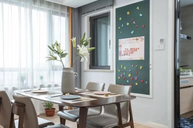 餐桌上餐具、花艺等,让用餐更有氛围了。在厨房门一边的墙壁上,还装了一块黑板,上面可以记录一些东西,或者给孩子玩耍,再者还能装饰用,挺不错