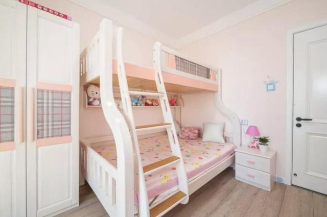 儿童房,选择了暖色系,视觉效果上要更温暖、温馨一些。儿童房购置了上下床,床尾还放着一个衣柜,不大的空间,这些基本实用的家具搞定,就好了。