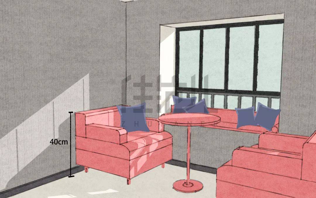 一般沙发和椅子的坐高为40-45cm,飘窗不足45cm,可以加坐垫,把高度差补上来。如果空间足够,可以在飘窗前做餐区,也可以做休闲区。