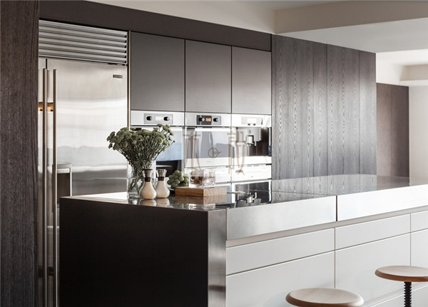 初始以业主喜爱的白色大理石定调,辅以灰色阶的色调搭配;考虑灰阶对象的质感突显,在色调统一的前提下挑选不同质地的材料,连贯中制造材质上的变化。另外,以凹折的L型铁板作为贯穿全室的踢脚板使用,呈现细节丰富度;并依循天际线原则,将立面材质统一在同等高度,于标准规范中寻求变化,形成视觉的一致感。