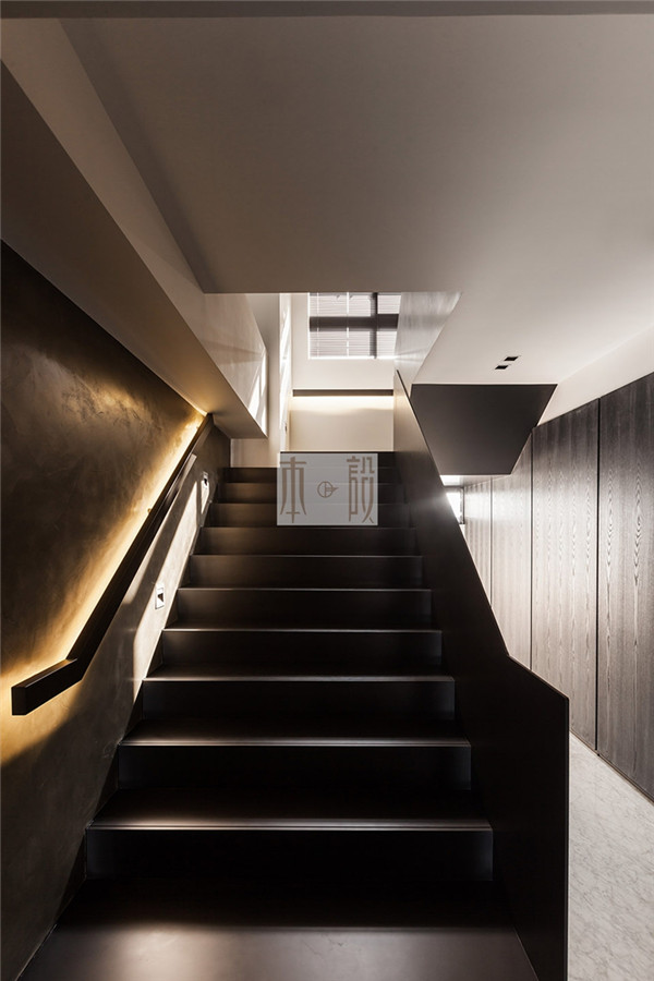 利用向上方楼层转折的灰黑铁板及座落于楼板间的吊灯延续空间一体性,原为水泥建构的楼梯以黑色铁板包覆,利落的几何切割方式使楼层间的灰黑元素拥有完整的连贯,崁有光带的扶手形塑指引效果,配搭壁崁灯可选择灯光模式,营造不同情境的光影气氛。