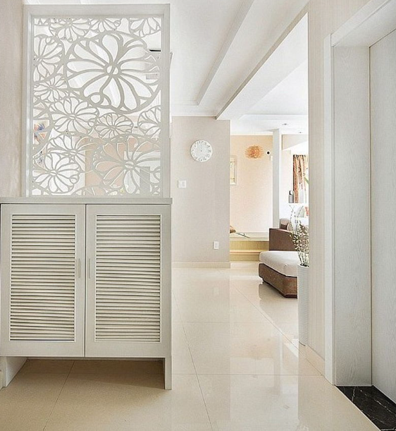 1. 夹板玄关,因为夹板的可塑性强,可以根据业主的需求来加工出各种各样的图案,比如一些抽象的镂空花纹。这种客厅玄关是当代比较流行的装修方式,同时也体现了居住者的品味。