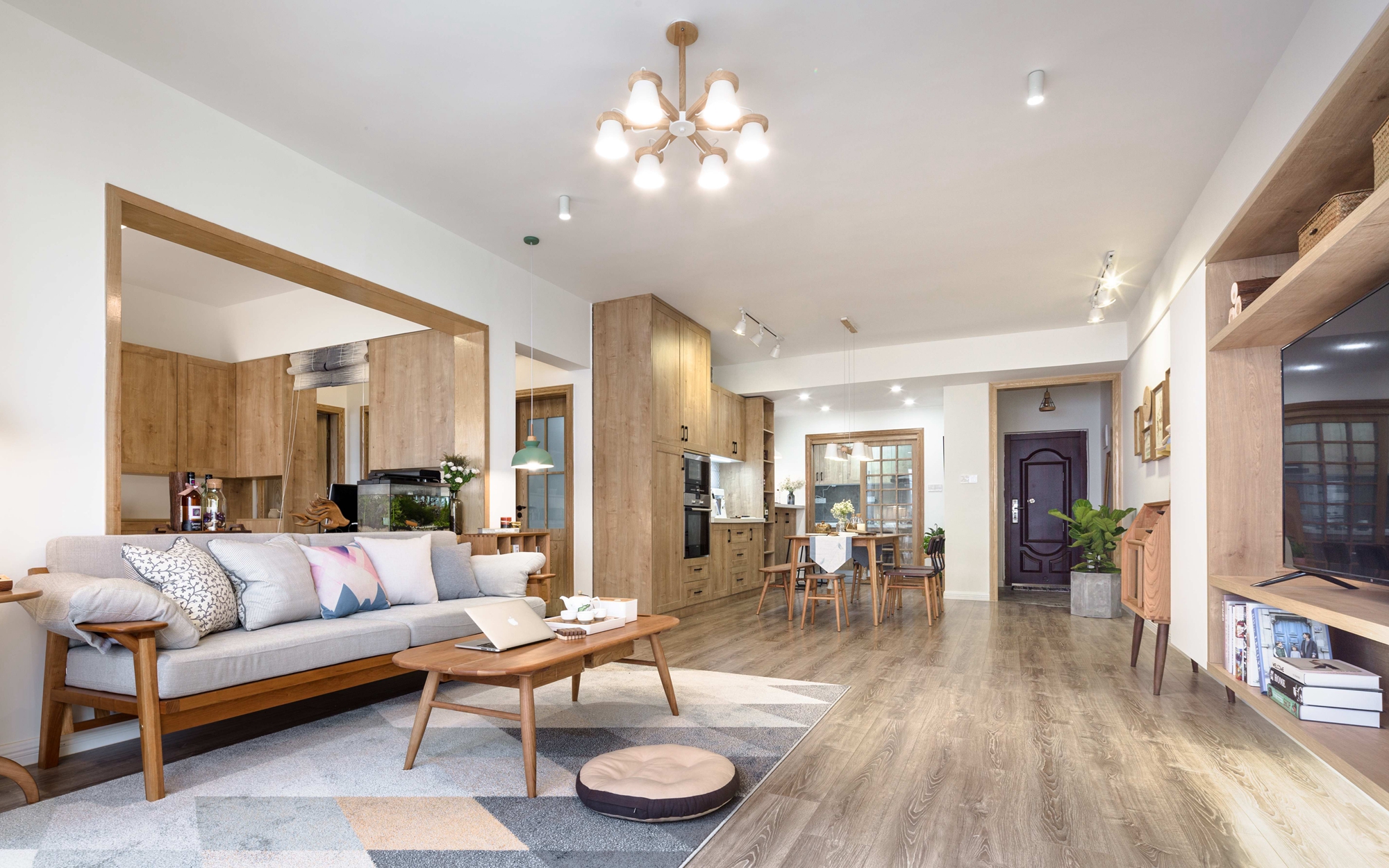 简约日式风格室内装修大致色调以乳白色、米白色主导,比如乳白色的墙面、胡桃木色的木地板、深灰色的布艺沙发等,部分再加上一些光泽度原素。进而使全部室内空间颜色温暖和睦,分毫不显低沉,还可以简易地配些绿植,是整个室内空间更具有清爽的自然界气场。