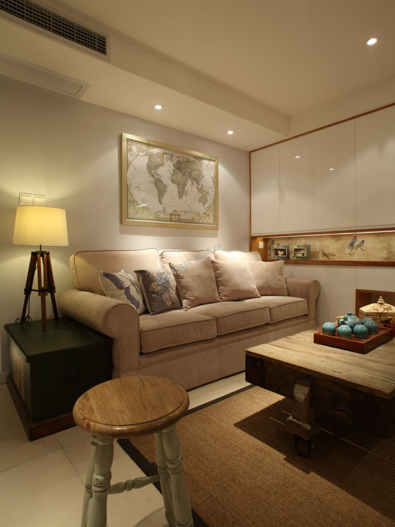 小三居家庭客厅白色布艺沙发装修摆放图片