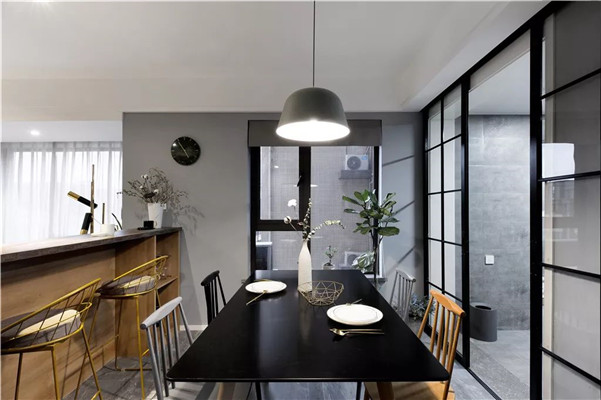 ▲餐厅以黑色的餐桌+黑灰木色的餐椅布置,结合黑框的玻璃门,让用餐氛围更加端庄雅致而情趣。