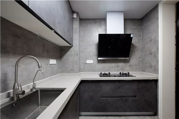 ▲水泥灰颜色的厨房,L形的操作台布置,让做饭的空间也是轻奢优雅而又简洁大方。