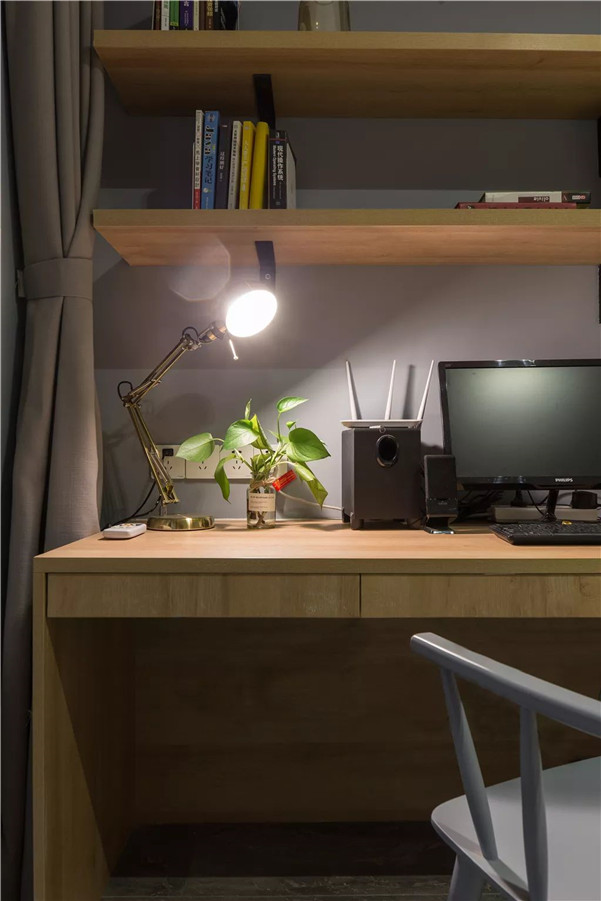 ▲过道推门旁边的是书房空间,定制一张榻榻米床,一张木色的书桌,带来一个宽敞舒适的办公游戏空间。