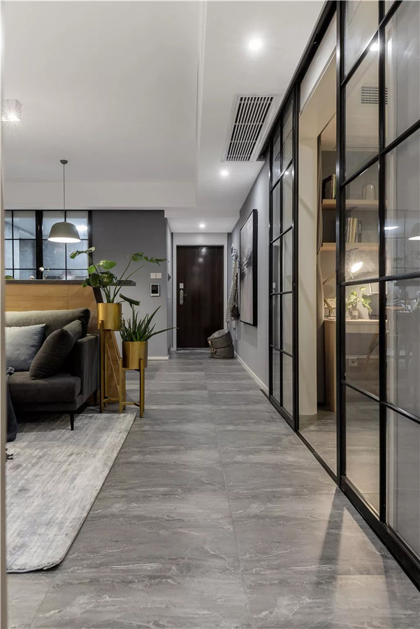 ▲过道在灰色地砖墙面的基础,结合黑色的玻璃推门,墙面黑白调的装饰画,布置出一种连贯舒适的空间感。
