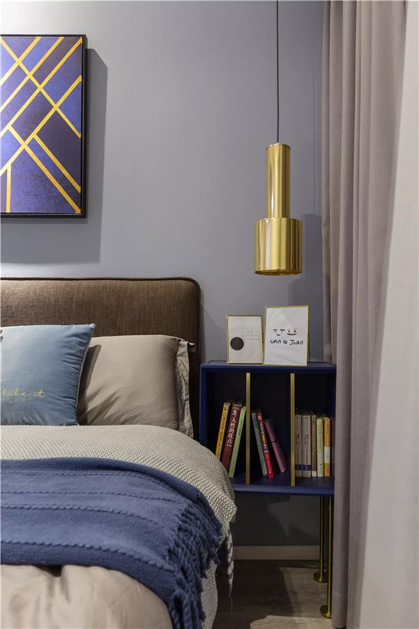 ▲床头两侧分别是床头柜与小书架,白色与铜色的吊灯呼应,让空间显得更加活泼有趣。