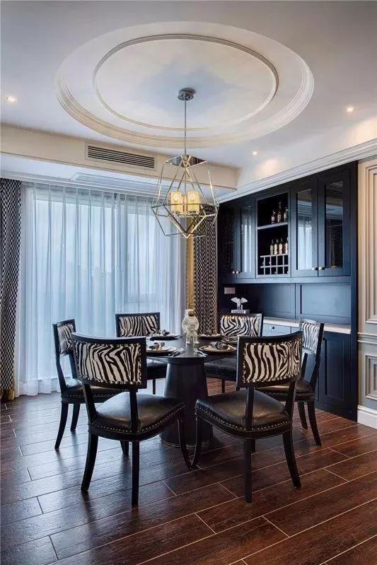 现代风格的餐厅吊顶,往往比较简单为主,四周吊顶+灯槽,如果是圆桌的话,也可以装个圆形的吊顶。