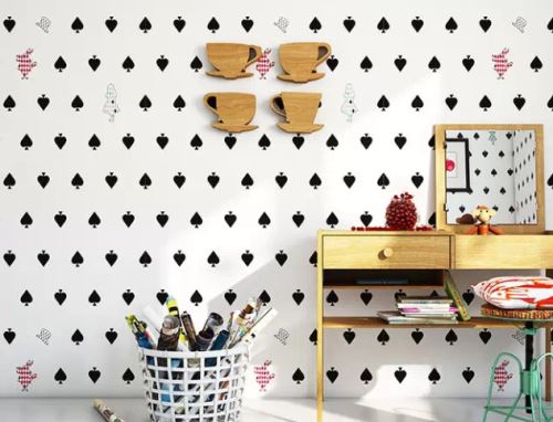 这幅简约墙面壁纸装修效果图展示的仅仅是房间的一个角落,但是扑面而来的可爱气息将我们都笼罩在了里面。简约墙面壁纸的底色与上图一样为白色,但是花色的不同营造的氛围也是不同。小小的黑色图案在简约中透着精致,而墙面上四个木制小茶杯更是增添了一股原木风情。从桌子以及一些物件来看,这个房间并不是非常整齐有序,但即使这样却并不杂乱。这个简约壁纸装修展现出了浑然天成的随性与自由。
