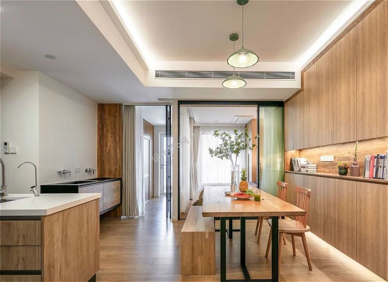 80平简约原木风二居室餐厅厨房一体装修案例