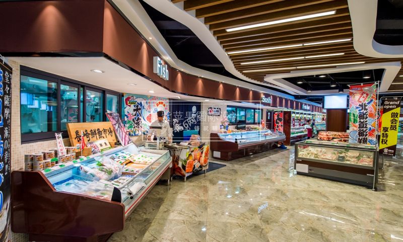 设计理念: 吾仁居瑞思买超市整体室内设计由刘营部担纲,以不同材质的搭配、巧妙的材料收口手法突出空间的精致,基于建筑内部不同的空间特点予以艺术光源作点缀。空间氛围积极且又彰显出人文内涵,身临其境可实现人、物品、光三重情感的呼应。这家门店的面积约在2500平米左右,层高高达2.6米,为节省开支没有对整体结构进行改造,整体空间的设计师充分利用现有空间条件,将吊顶、吊楣、货架高度做了黄金分割,地面材质也大胆选用亮面防滑砖,让消费者置身空间中感受不到空间高度的压抑。简单的英文字吊楣在背景映衬下显得格外高端大气,另一方面,如此醒目的吊楣也能够迅速引起消费者的注意,起到了非常好的导视作用。独创的嵌入式货架很好的利用了超市狭长的空间,沿着墙边的货架走过,就基本能把超市的大部分商品浏览完,虽然超市空间不大,但并不追求货架的过多摆放,低矮疏散的货架陈列一方面能够拓宽消费者的视野,另一方面能够营造宽松舒适的购物环境。设计师把粗犷和细腻的纹理所造成的反差强烈的木饰面、柔和坚硬的不锈钢和轻盈柔美的清水水泥板,相互结合起来,用光影进行绝妙的控制,为的就是打造独一无二的国际范高端超市。 吾仁居瑞思买超市整体室内设计由刘营部担纲,以不同材质的搭配、巧妙的材料收口手法突出空间的精致,基于建筑内部不同的空间特点予以艺术光源作点缀。空间氛围积极且又彰显出人文内涵,身临其境可实现人、物品、光三重情感的呼应。这家门店的面积约在2500平米左右,层高高达2.6米,为节省开支没有对整体结构进行改造,整体空间的设计师充分利用现有空间条件,将吊顶、吊楣、货架高度做了黄金分割,地面材质也大胆选用亮面防滑砖,让消费者置身空间中感受不到空间高度的压抑。简单的英文字吊楣在背景映衬下显得格外高端大气,另一方面,如此醒目的吊楣也能够迅速引起消费者的注意,起到了非常好的导视作用。独创的嵌入式货架很好的利用了超市狭长的空间,沿着墙边的货架走过,就基本能把超市的大部分商品浏览完,虽然超市空间不大,但并不追求货架的过多摆放,低矮疏散的货架陈列一方面能够拓宽消费者的视野,另一方面能够营造宽松舒适的购物环境。设计师把粗犷和细腻的纹理所造成的反差强烈的木饰面、柔和坚硬的不锈钢和轻盈柔美的清水水泥板,相互结合起来,用光影进行绝妙的控制,为的就是打造独一无二的国际范高端超市。