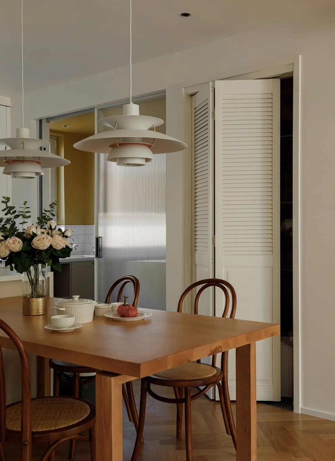▲ 餐桌背后是一扇折叠门,隐藏小储物间