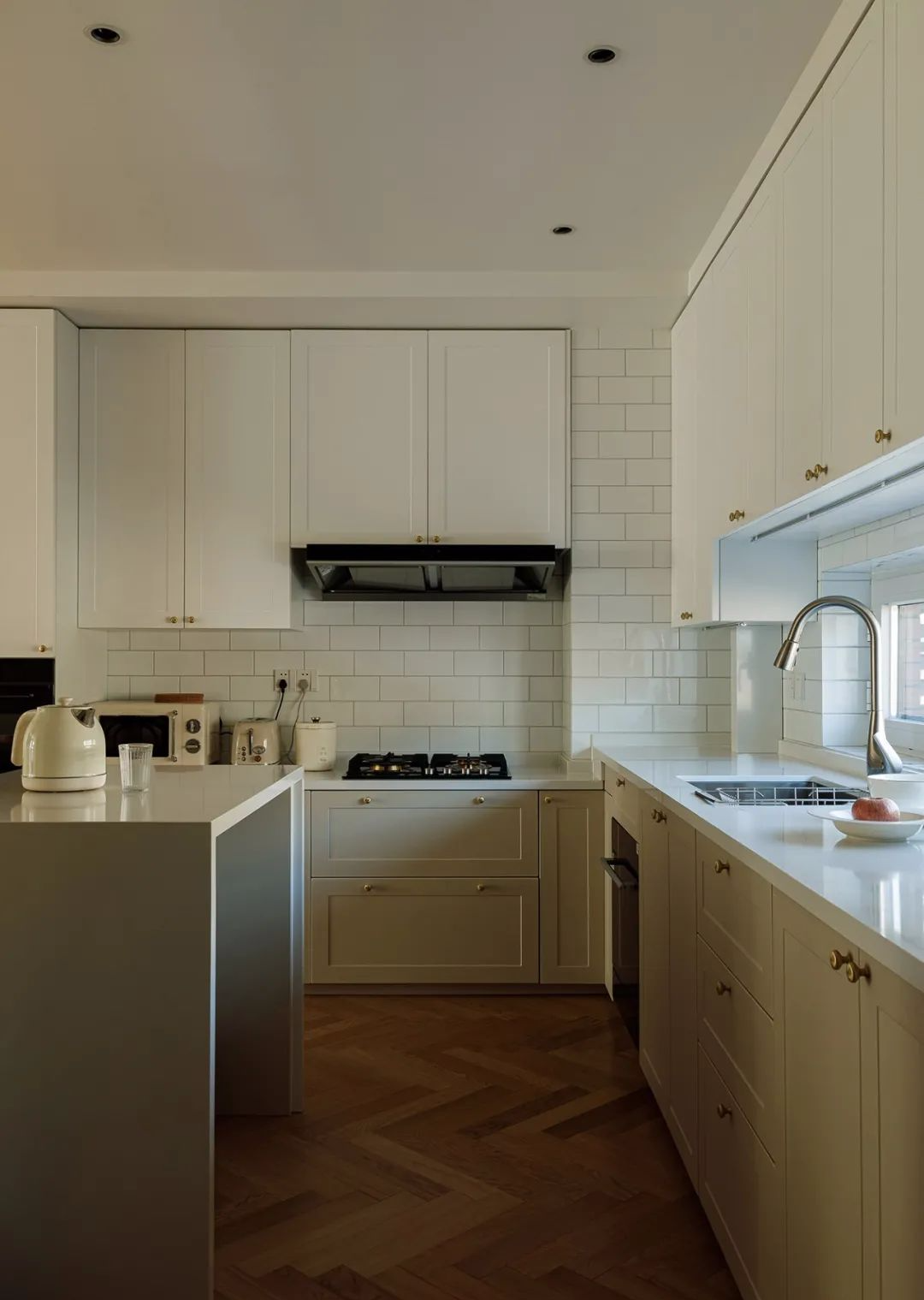 ▲ 餐厨以餐桌和岛台为中心,形成洄游动线,工字铺的白色墙砖与简美橱柜搭配出小复古的味道