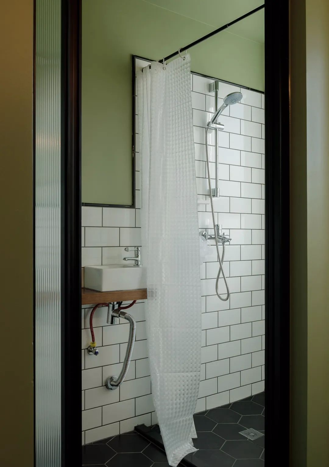 ▲ 卫生间干湿分离,造型复古的镜前灯搭配黑色台盆柜,地砖的风格和色彩也随之呼应