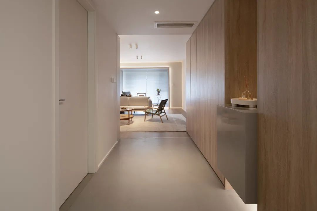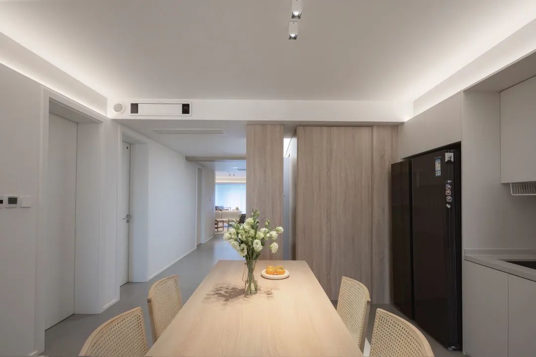 入门左转,客厅的反方向就是客厅,在进门的玄关处,就能透过立柱和墙体的缝隙看到餐桌上花瓶里的鲜花,鲜艳明丽,等着你回家。