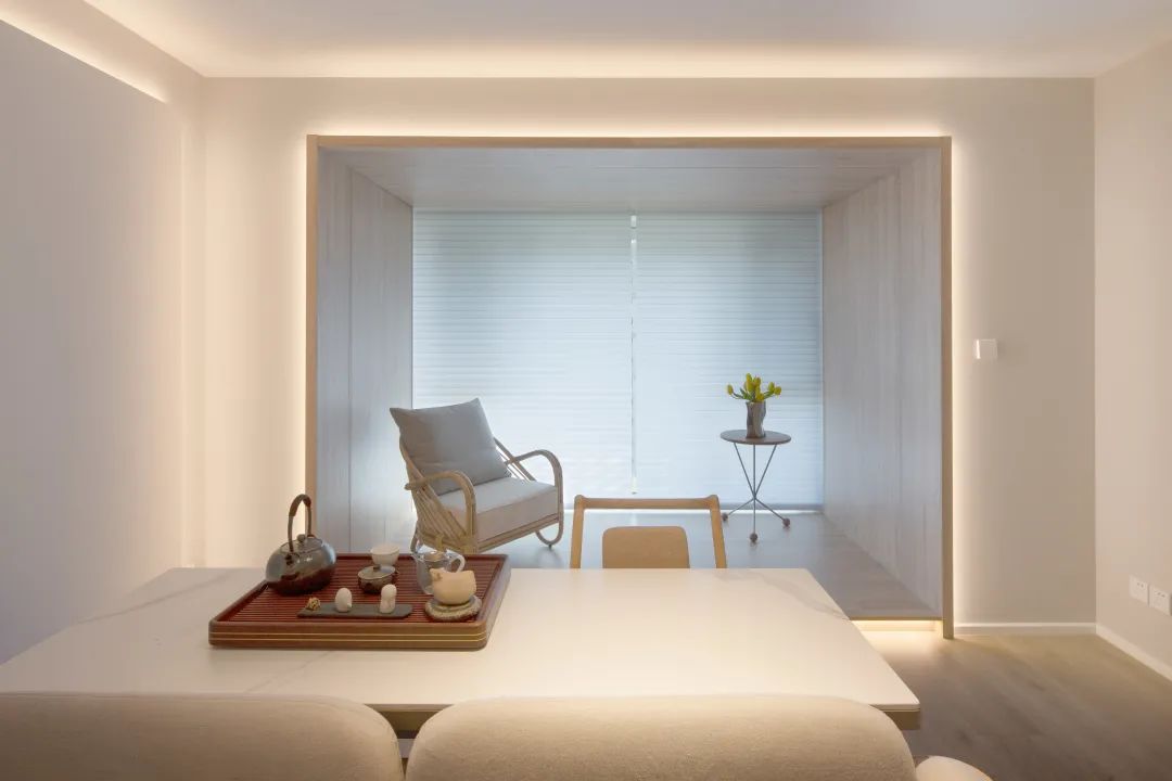 茶桌的加入使整个空间形成了两个功能区,设计师又分别通过灯光和墙面线条进行了一定的指引和划分。