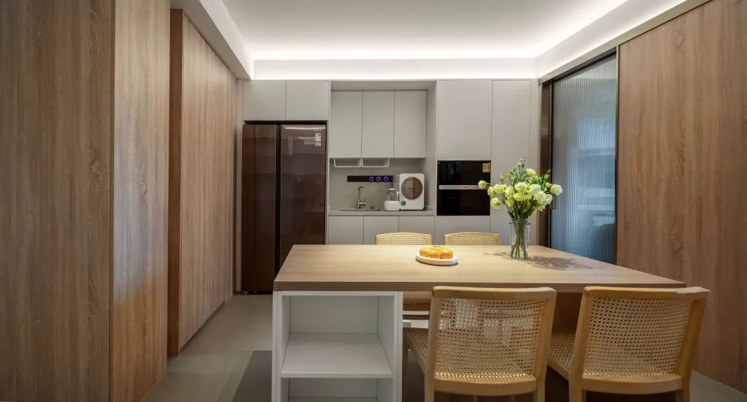 餐厅边缘位置,设计了一个小西厨。一个水池、一块操作台、一个烤箱、上下两排收纳柜,再加上一个双开门冰箱,形成了一个功能齐全的小西厨。