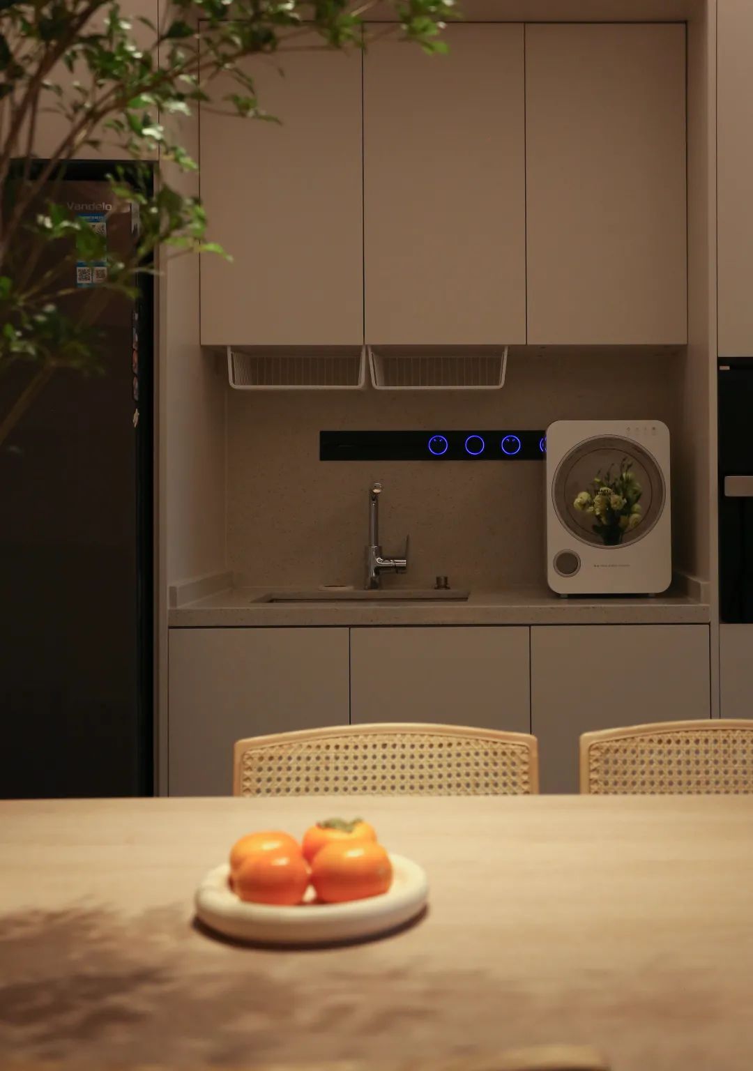 家政间的空间并不是很大,但是功能完整且独立,位置就在小西厨边上靠窗的位置,由晾晒区、洗衣区和收纳区组成。