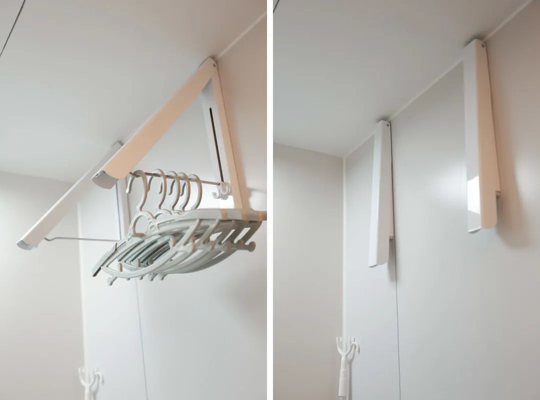 在收纳柜的边上有两个可收缩短衣架,用于悬挂一些备用衣架或是中转的衣服。两排收纳柜用于收纳日常清洁用具和洗涤用品完全足够。