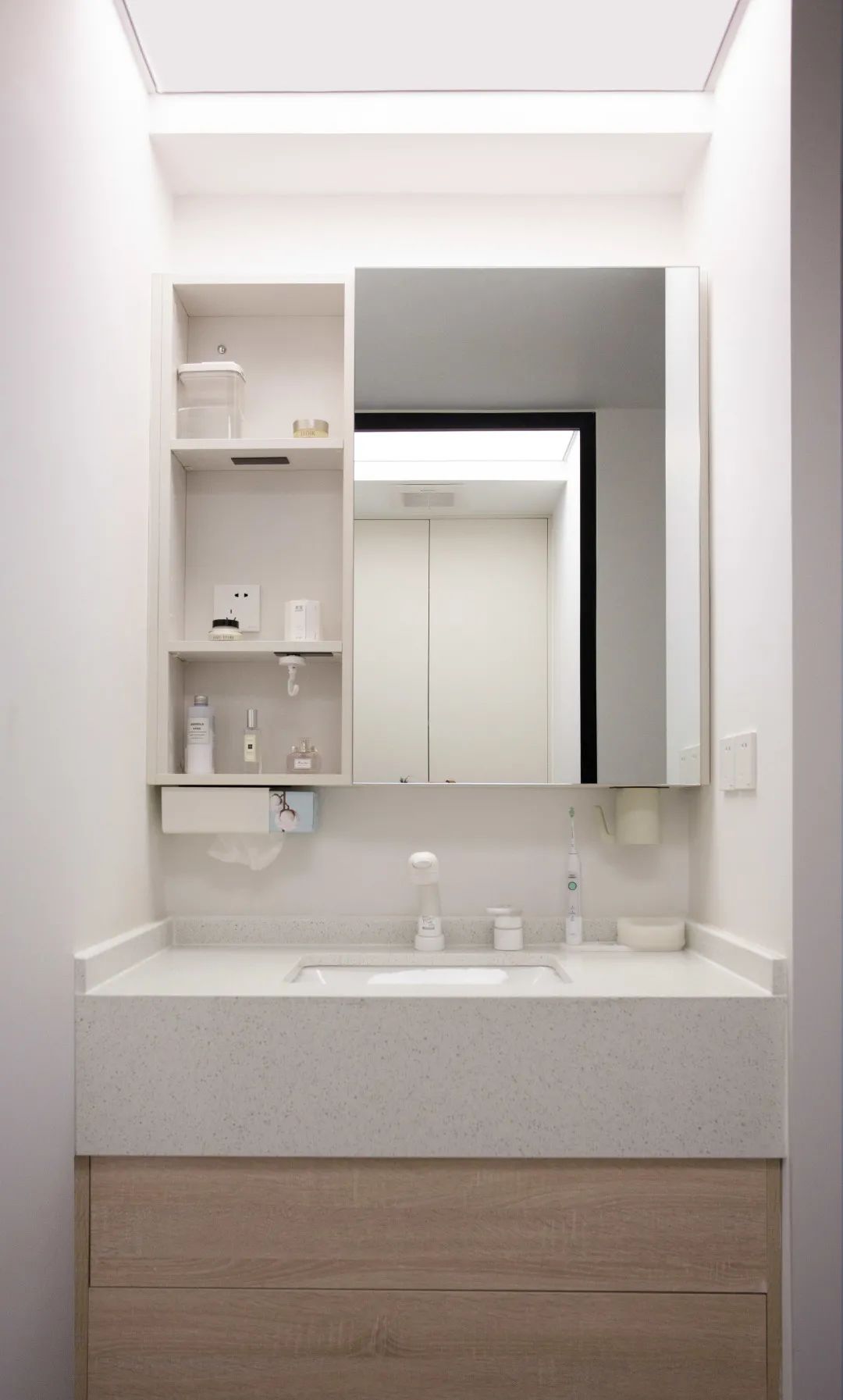 主卫靠内的位置无法接收到自然光,于是在洗手台的上方,安装了软膜天花,有自然光线的同时,也不会形成聚集光柱,解决了暗卫光照不足的关键问题。
