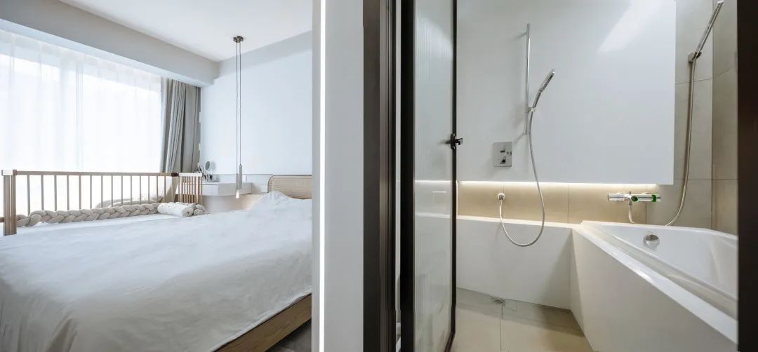 在主卧安装了一个坐式浴缸,占地面积较小,也可以很好地满足宝宝洗澡的需求。