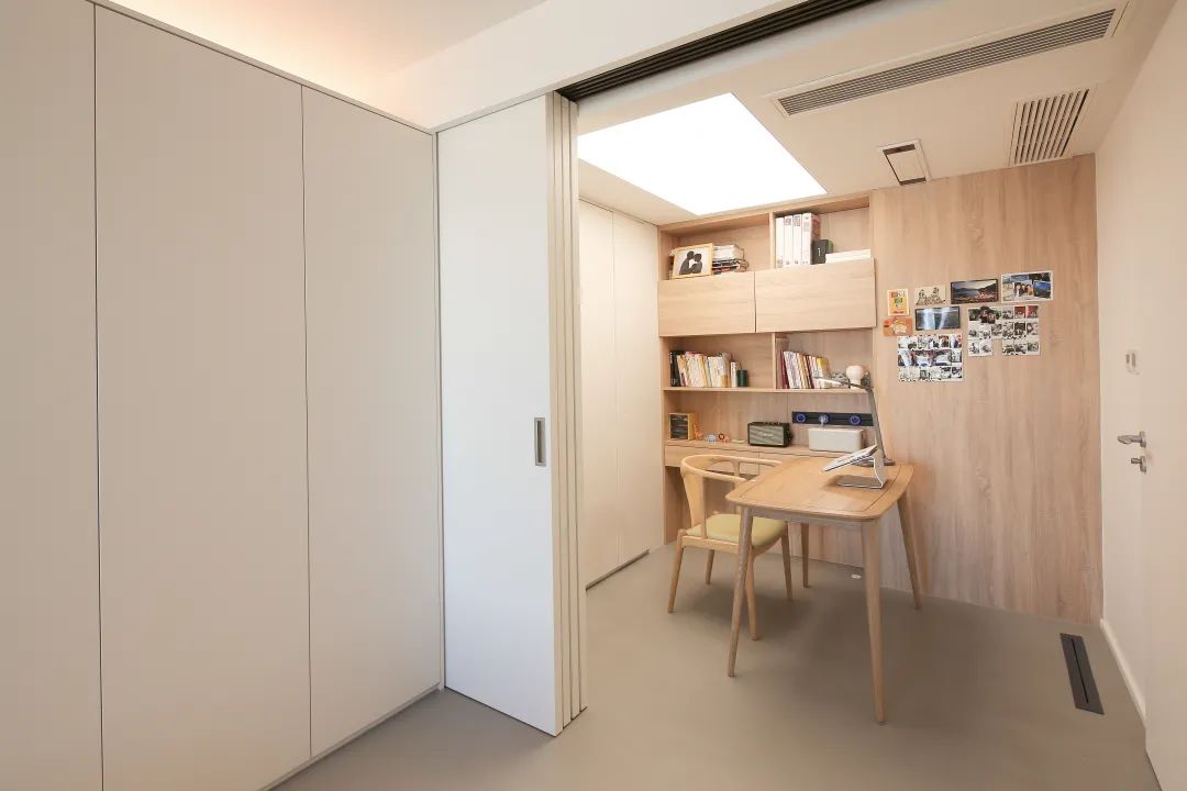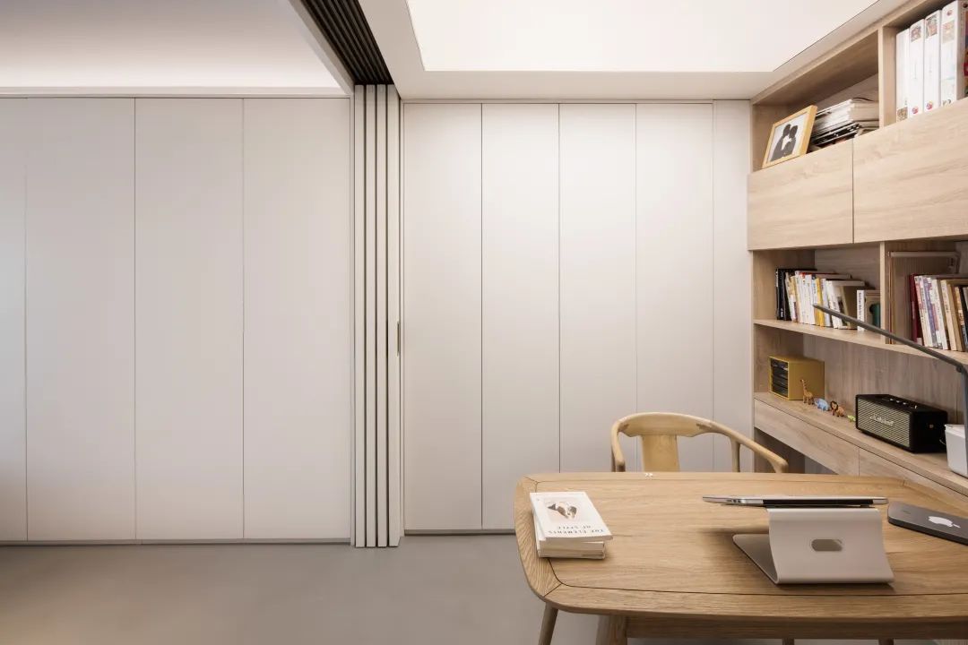 在房屋规划设计中,整个次卧被划分成了两个部分。一边卧室,一边书房,中间通过吊轨推拉门进行了分割。两个功能区相互独立,互不干扰。