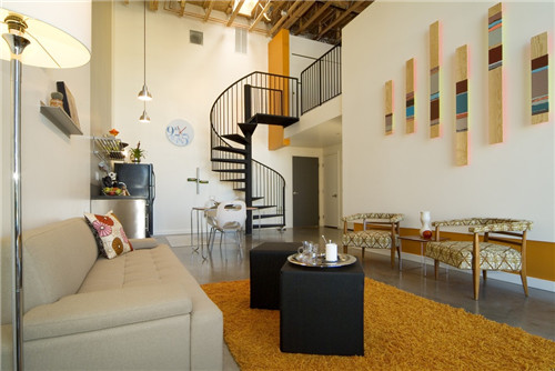 复式楼往往会采用楼梯来进行上下层空间的连接,由于楼梯使用较为频繁,我们在设计时,应注重实用性,选择较为有质感的木材或是石材,不仅让楼梯拥有不错的装饰效果,而且使用年限较久。关于造型方面,我们可以采用弧形或是曲线,让楼梯带有律动感。