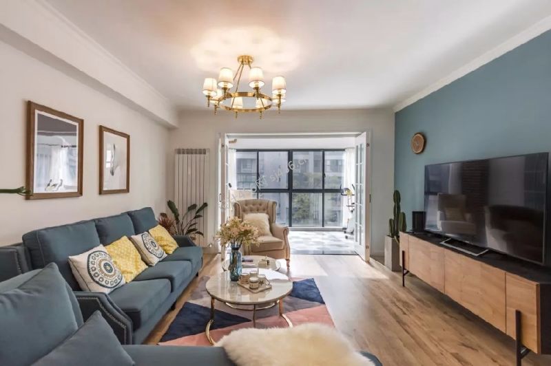 美式风格118平米三居室客厅阳台一体设计装修效果图