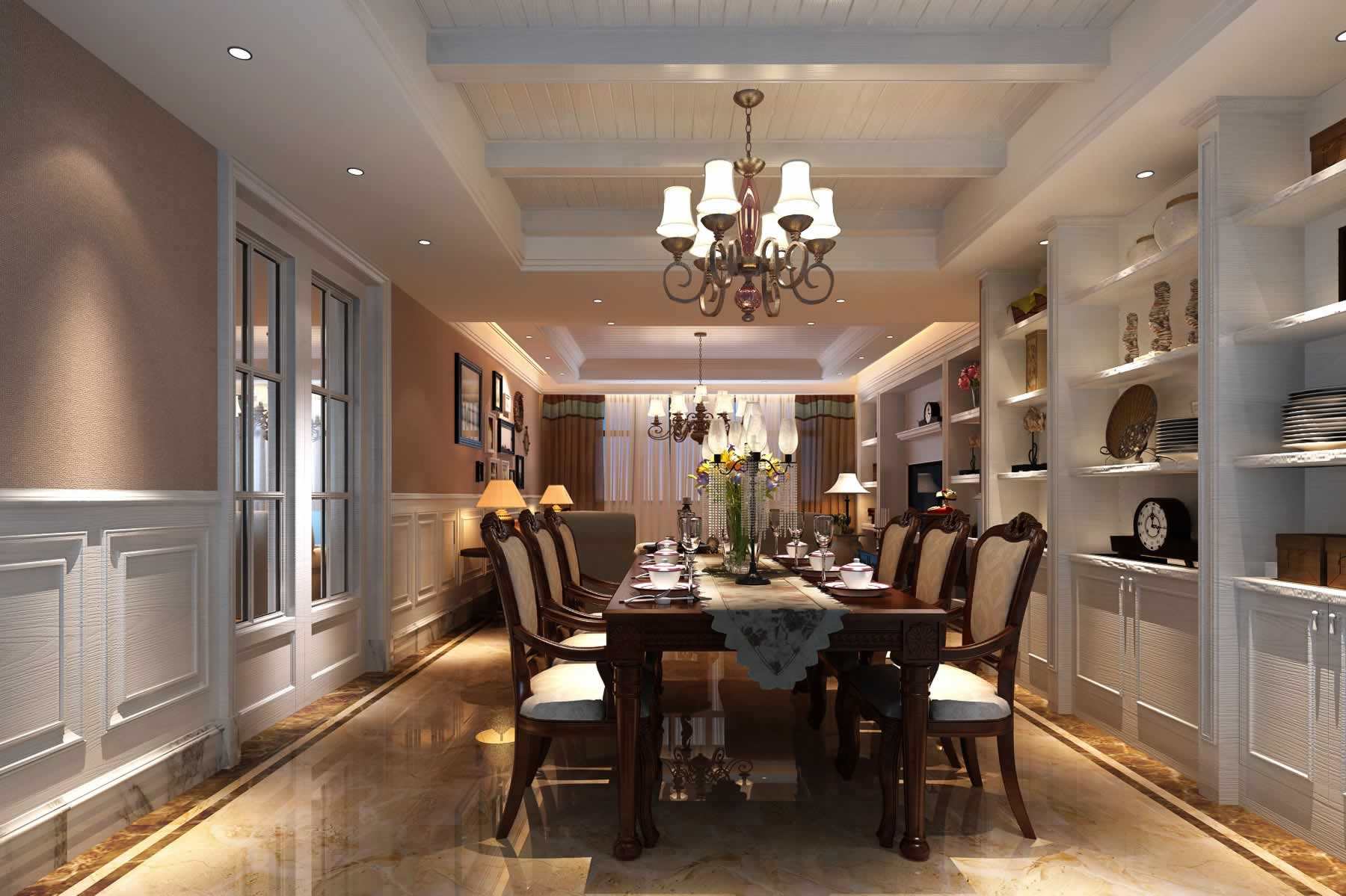 黄灯光,就可以避免距离感的产生。当然,除了可以营造氛围之外,微暖的灯光也可以让食物看起来更有食欲,令人胃口大开。另外,在布置餐厅灯光时,可以选择吊灯与壁灯、筒灯相搭配,让空间的光影变化更加丰富,不但发挥着照明的作用,而且还能拥有不错的装饰效果。