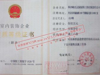 陕西峰光无限装饰工程有限责任公司,注册资金500万,具有设计施工双乙级资质,是一家从事住宅建筑设计、装修设计与施工的专业化装饰公司。并被西安消费者协会评为“消费者满意单位”、“诚信企业”。多次被华商报评为“消费者最信赖的家装企业”,西安晚报评为“消费者信得过装饰企业”。 2005年被评为西安家装行业十强品牌、“零投诉”王牌装饰企业、西安家装行业“阳光行动”示范单位、“诚信单位”、中国西安家居总评榜“消费者最喜欢的家装品牌”,中国室内装饰协会评为陕西唯一一家“全国室内装饰优秀施工企业”。2006年被中国(西安)家居总评榜评为"消费者信赖的家装企业",“西安家庭装饰行业综合实力优秀企业”,“陕西省家庭装饰示范企业”.