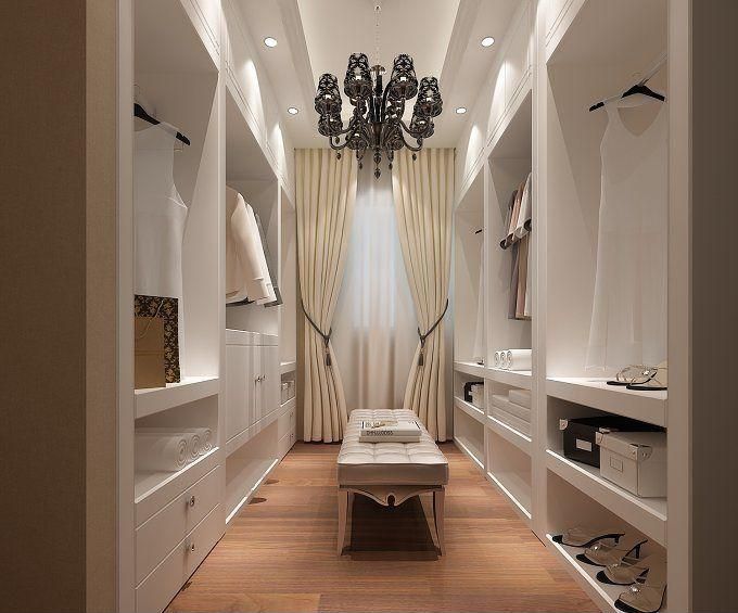 绝大部分的步入式衣帽间都是左右衣柜的布局,中间留出一个走道,也连着窗户,这样采光会更好一些,看着更舒服。