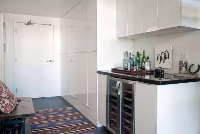 以白色为主色调的玄关看起来特别的整洁明亮,右手边的柜子收纳功能是非常强大的。还搭配看了一个简易的橱柜,放置酒水,表哥果然是一个有生活情趣的人。