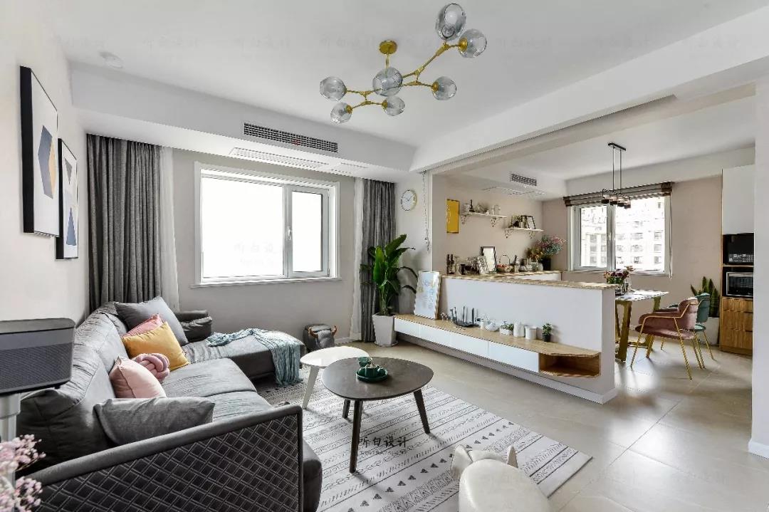 根据现场的情况,比如在客餐厅中间吊顶之间、或是阳台一侧的吊顶上装内机,让风对着整个客厅横向吹,这种相对来说整体空间的温度会均衡一点。