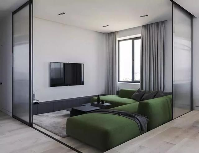 从客厅就可以凸显出主题色满满的森林绿主题色系,而电视背景墙则选择了更现代简约质感的灰白色系。灰色地毯和大理石圆面金属质感茶几和其他配饰软装,都成就了客厅自然美好的画面。