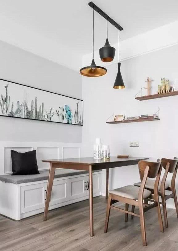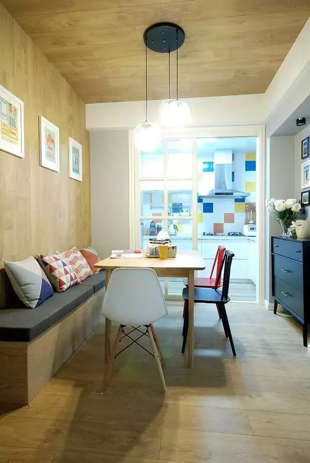 卡座型餐厅隔断。入户走廊靠近餐厅区域,采用卡座+入户柜的组合,既能当座位又能做收纳,节省了客厅的空间,尤其适合小户型。