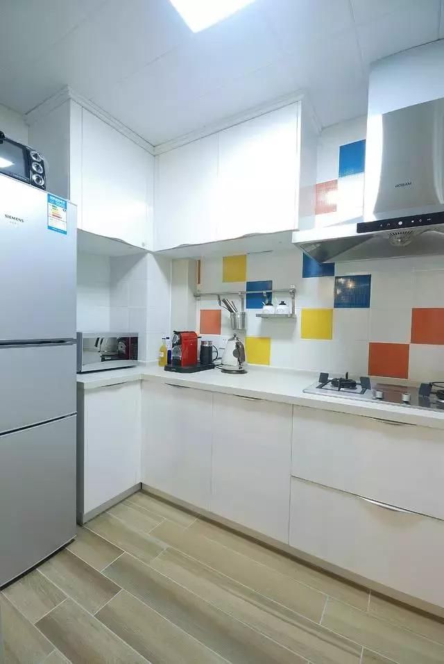这是餐厅和厨房,厨房门两边改做了储物柜,效果好看,而且还可以提供很多的储物空间,打了柜子很实用,给人的感觉也比较有设计感。布置方形餐桌,比较耐脏,不过这种餐桌很大气,平时也不方便挪动位置。墙上再挂上装饰画,效果更完美。