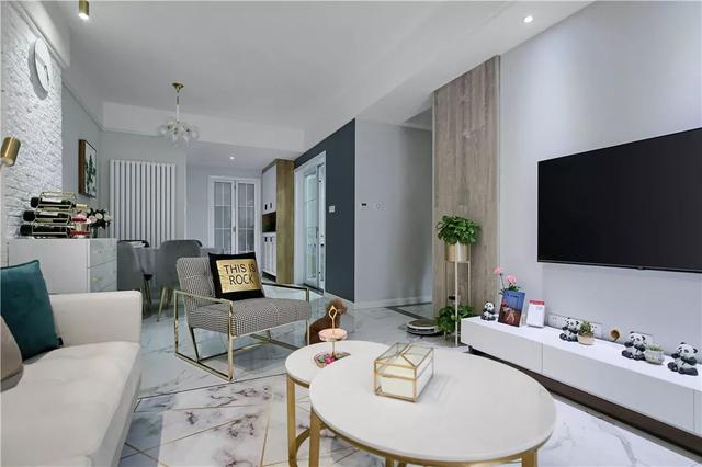 ▲电视墙简洁的基础,在左侧加入一道木饰面的设计,搭配一个洁净的白色电视柜,布置上小饰品与绿植点缀,呈现出一个年轻舒适的北欧氛围。