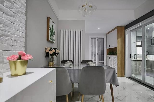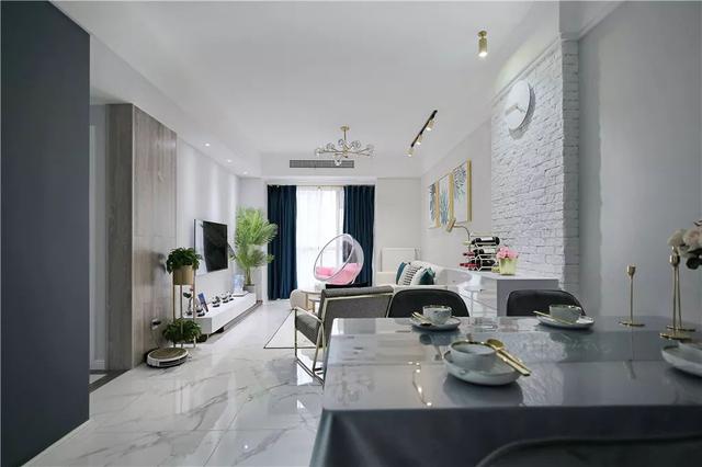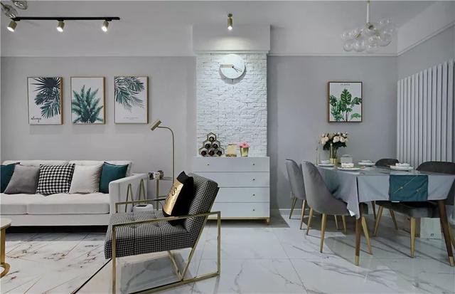 ▲客厅与餐厅中间,装了一个凸出的白色文化砖造型,挂上一个时钟,再布置一个斗柜,整体显得文艺精致好气质。