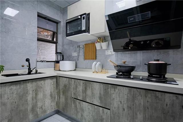 ▲厨房在灰色抛光砖墙面地面的基础,搭配一个独特复古灰调的橱柜,让做饭的空间也文艺轻松自然。