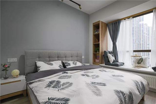 ▲主卧在简约灰色的空间基础,搭配一张布艺靠背的床铺,还有羽毛图案的床单,整个灰色调的空间,显得简约年轻也舒适自然。