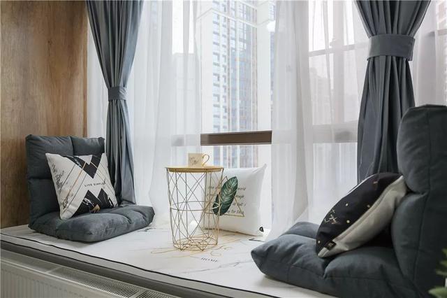 ▲床头柜与飘窗里的木质感,则让这个充满灰色调的空间显得更加华丽端庄自然。