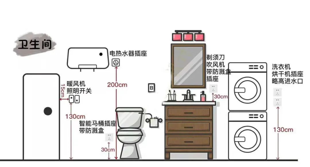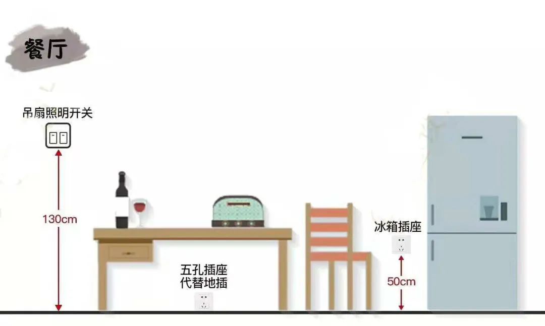 说到地插的安装位置,那就再说个“附加小知识吧”!家里其他插座在设计位置时,要秉持“就近原则”,这样就避免电器找不到插座的尴尬了,并且有小朋友的家庭尽量把插座藏在小朋友看不见、摸不到的地方。各个居室需要的插座类型、高度、数量等可见下图: